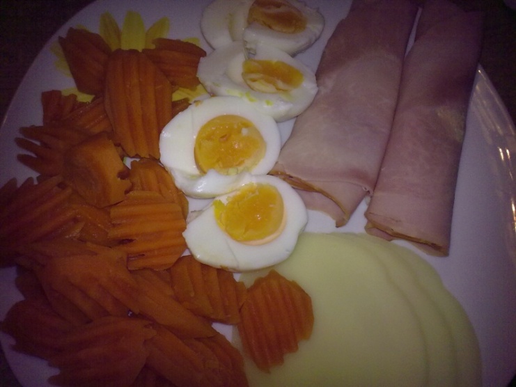 večeře: 160g mrkve na páře, 2 plátky Zimbo šunky 95%, 2 necelá vejce na hniličko (na obrázku je i sýr ale ten se do mě už nevešel)