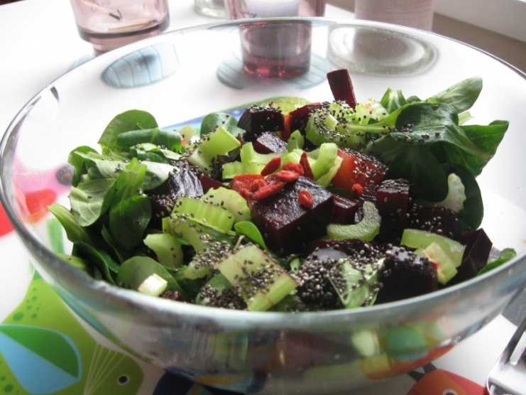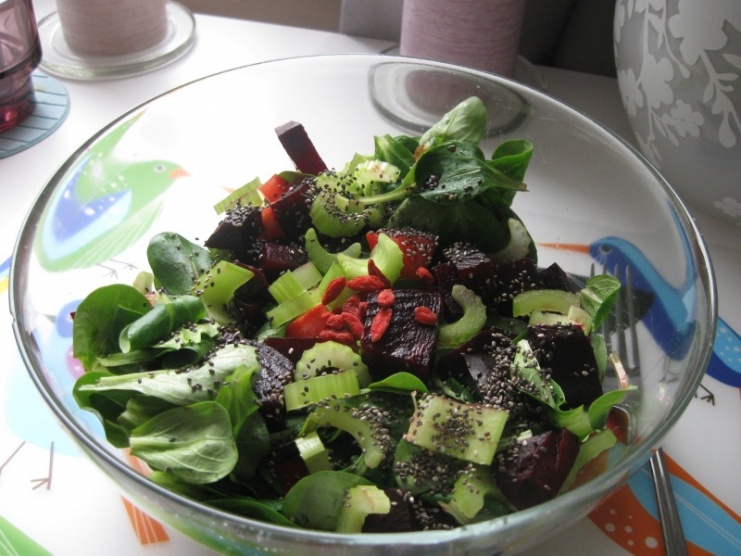 Jinak tato kombinace v salátu byla jednoduše dokonalá. Řepa- polníček- řapíkatý celer- chia- rajče.