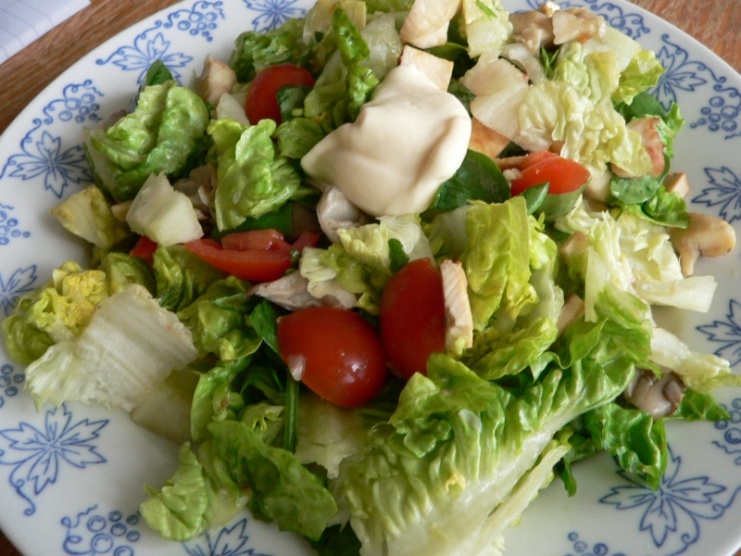 Ve: velký salát z little gemu, špenátových listů, cherry rajčat, uzeného tofu, orestované hlívy + troška light majolky