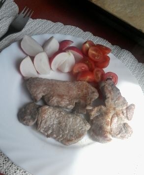 OB: steak z krkovice (odřezala jsem si jen libové) a k tomu lžíci rýže a zelenina(ředkvičky,cherry)