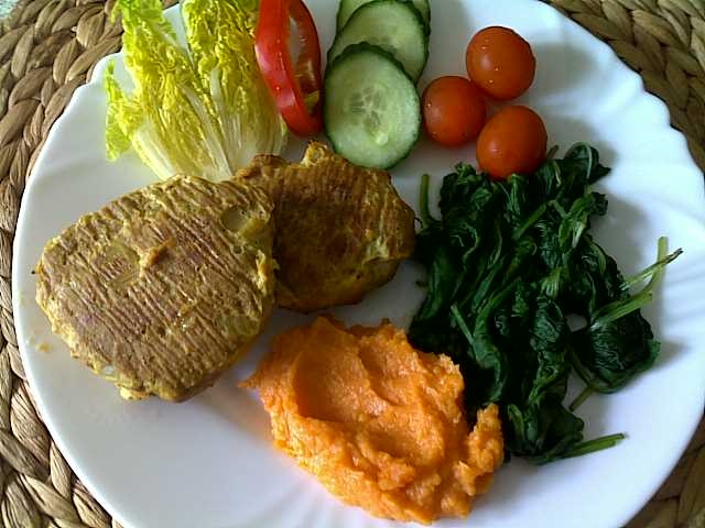 * 3 cikánské řízky, batátová kaše, restovaný list. špenát a zelenina ( na fotce jsou jen 2, ale přidala jsem si ještě jeden