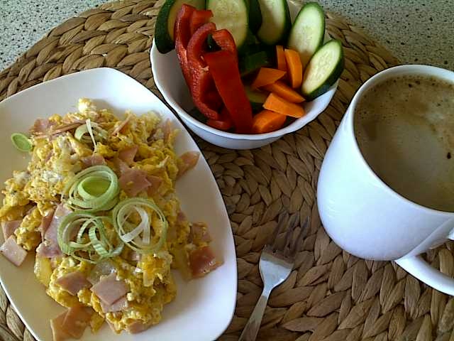 * ječmen+chlorella, bílá káva ( SM), 3 míchaná vejce na 95% šunce, zelenina viz foto