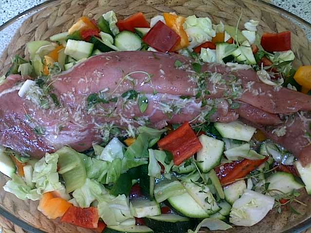 Vepřová panenka ( svíčková) na zelenině: vepřovou panenku naložíme na cca 2 hodinky)do směsi z olivového oleje, česneku a tymiánu čerstvého, do pekáče pokrájíme barevné papriky, cuketu a mladé zelí, ( nemusí být), přidáme tymián a zakapeme olivovým olejem osolíme a opeříme, navrh dáme naloženou panenku a pečeme při 1800C cca 30 minut, nezapomeneme obrátit.