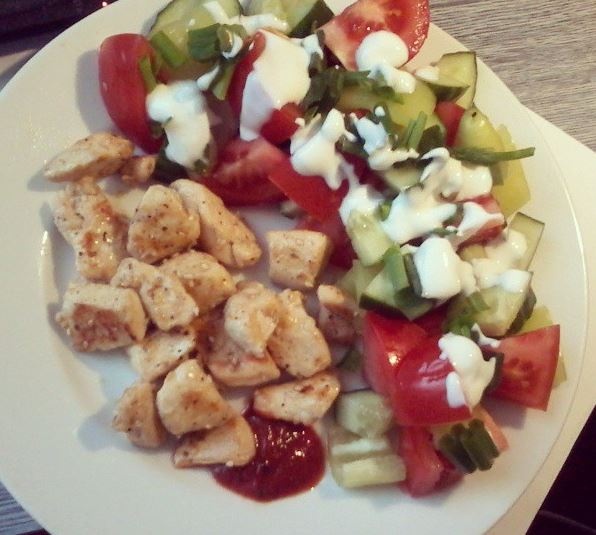 VE: kuřecí prsa posypané troškou sezam. semínek(120g,orestované na oliváči) s čerstvou zeleninou politou troškou jogurtu,lžička rajského protlaku mixlého s chilli omáčkou