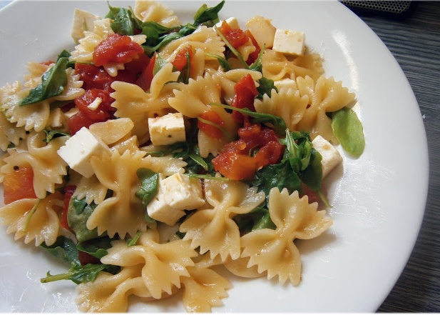 OB: mix kuřecí prsa s těstovinami,řeckým sýrem,rukolou a rajčetem