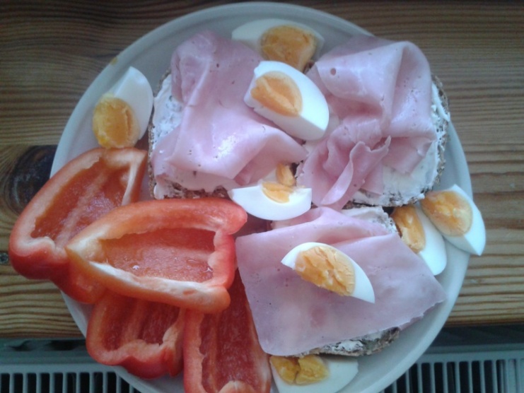 Sn: celozrnný chlebík+šunka+vejce+červená paprika