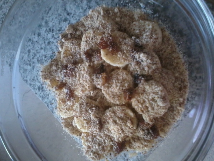 Sn: rýžová kaše s banánem 1ks, rozinky 10g, mandle 10g (rýže 50g, mléko 150ml) 1pl medu