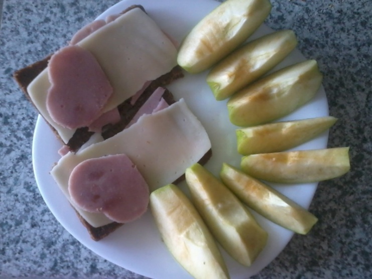 Sv: 1pl žitného chleba, 20g eidamu, 20g šunky, jablko