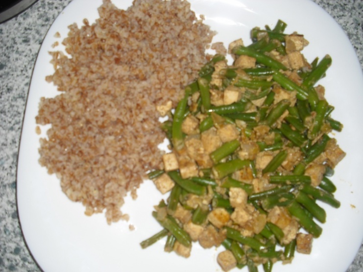 O: 50g tofu, cibule, 100g mražených fazolek, 3stroužky česneku, 2PL bílého jogurtu k tomu 50g bulguru