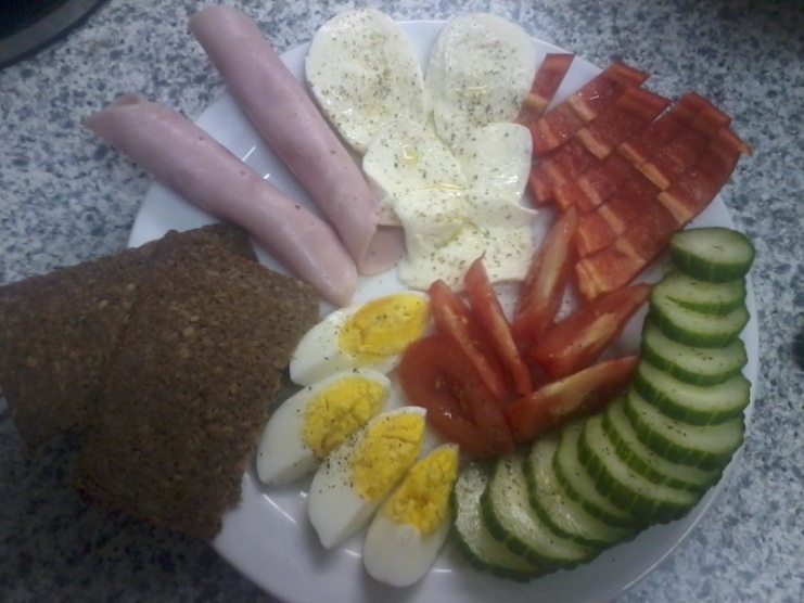 V: 1 vejce natvrdo, 5plátků mozzarely, 2pl šunky, 1pl žitného chleba, rajče, půl papriky a kousek okurky