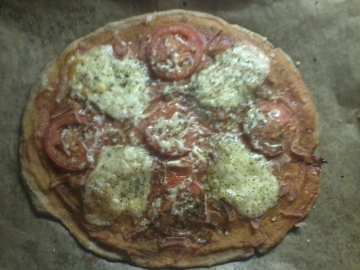 Večeře: celozrnná pizza - kelímek bílého jogurtu, kelímek od jogurtu celozrnné mouky, 1 vejce, špetka soli, půl lžičky prášku do pečiva, lžíce oliváče a na tom asi lžíce kečupu, 5 plátků rajčat, 2 plátky šunky, 4 plátky mozzarely a bazalka, snědla jsem půlku a stačilo