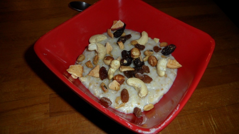 sn: ovesné vločky, arašídy, rozinky, sušené meruňky zalité odtučněným mlékem
