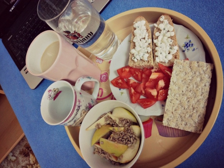 Snídaně: 0,7 l vody, Caro s mlékem (polotučné 100ml) a medem, grahamový rohlík 30g + wasa delikates 1x, cottage pažitkový 30g, rajče + jablko a slunečnicová semínka 10g