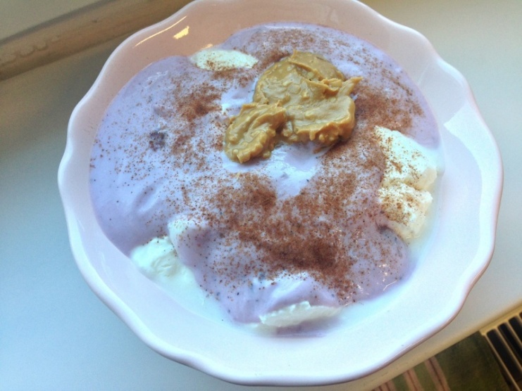 8:00 sn.: odtučněný tvaroh + selský bílý jogurt + borůvková activia + arašídové máslo a posypané skořicí