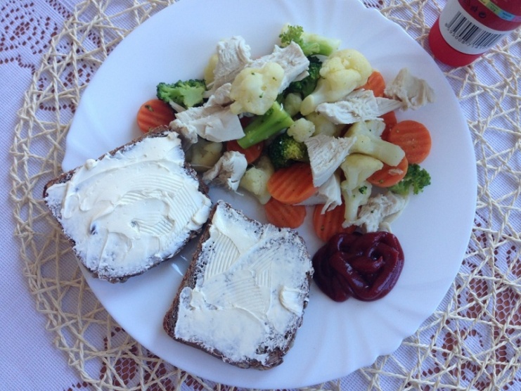 12:00 ob.: 200gr císařská zeleninová směs udělaná na troše flory light + kuřecí kousky + slunečnicový chléb mázlý trochou flory light a trocha dětského kečupu bez konzervantů