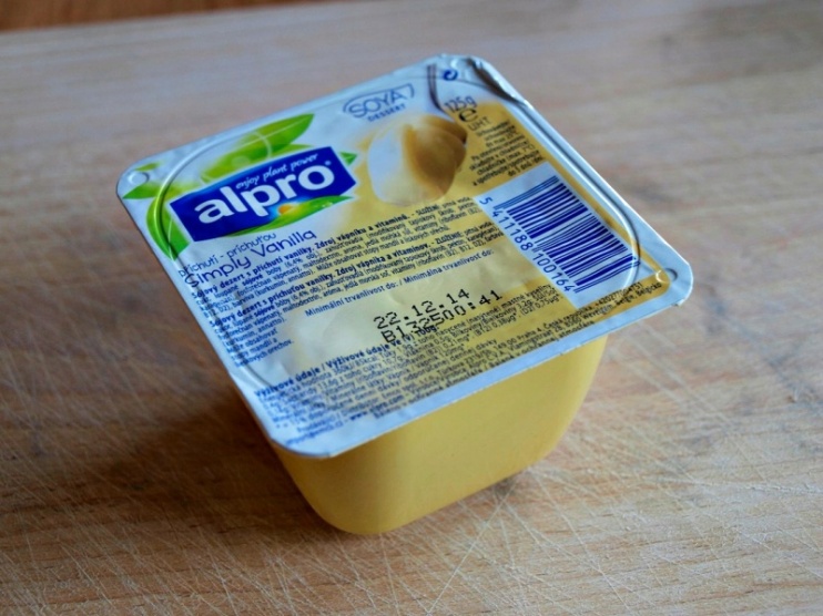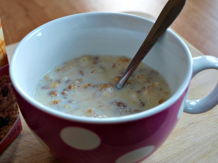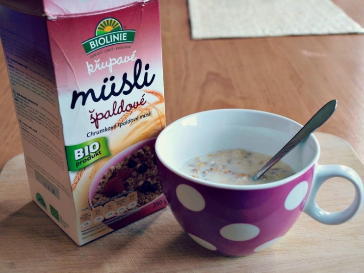 Snídaně: bioline špaldové kokosové müsli s polotučným mlékem, alpro sojový vanilkový jogurt, káva s mlékem 1,5%