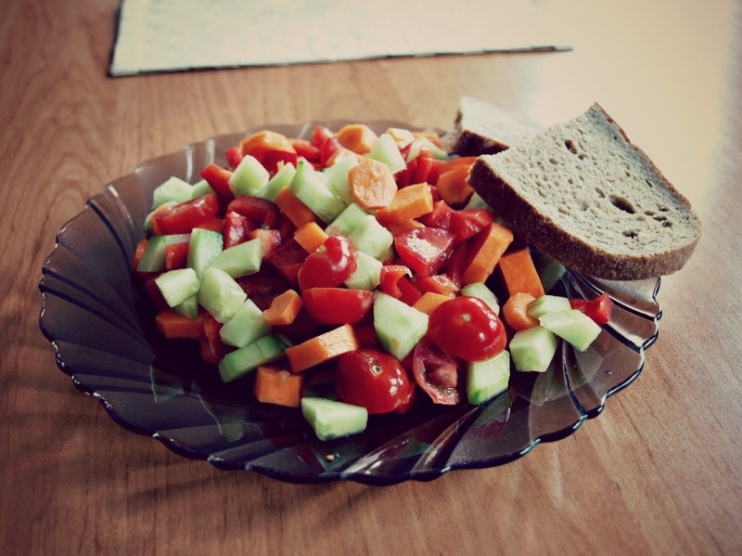 Svačina: zeleninový salát (cherry, okurka, červená kapie, mrkev) k tomu penam vícezrnný chléb