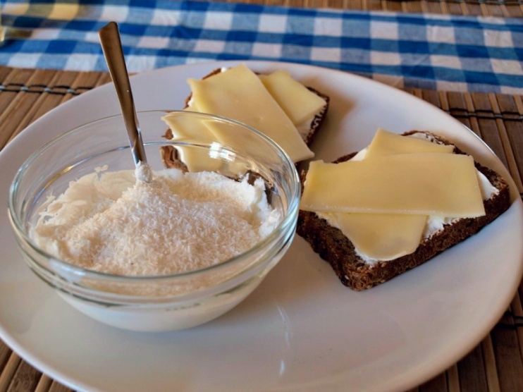 Večeře: 2 plátky špaldového chleba, lučina linie, 30% eidam 40g, tvaroh s kokosem
