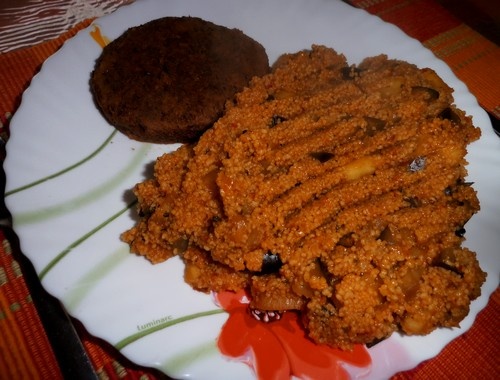 Oběd: čočkový burger, ochucený kuskus s lilkem a cuketou, přidávám foto tohoto vábně vypadajícího jídla