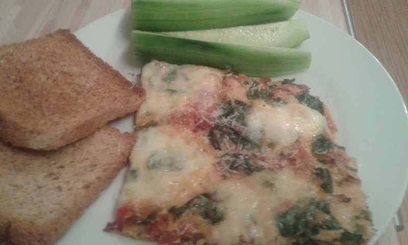 Vaječná omeleta s baby špenátem, rajčetem, cibulkou, mozzarellou a parmazánem, okurka,