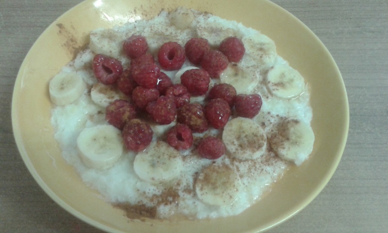 Rýžová kaše s banánem, malinami, skořicí a medem