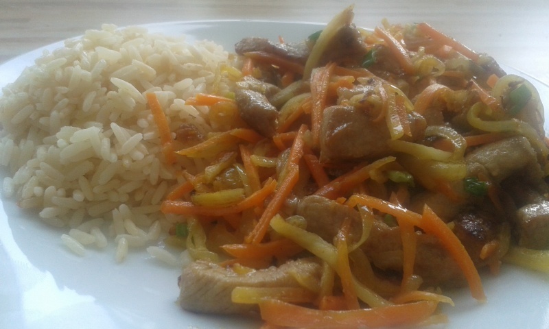 Asijská pánev - vepřové nudličky, mrkev, petržel, cibule, cibulka, černý sesam, rýže