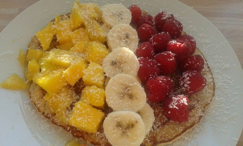 Ovesná placka s kokosem, malinami, mangem a banánem