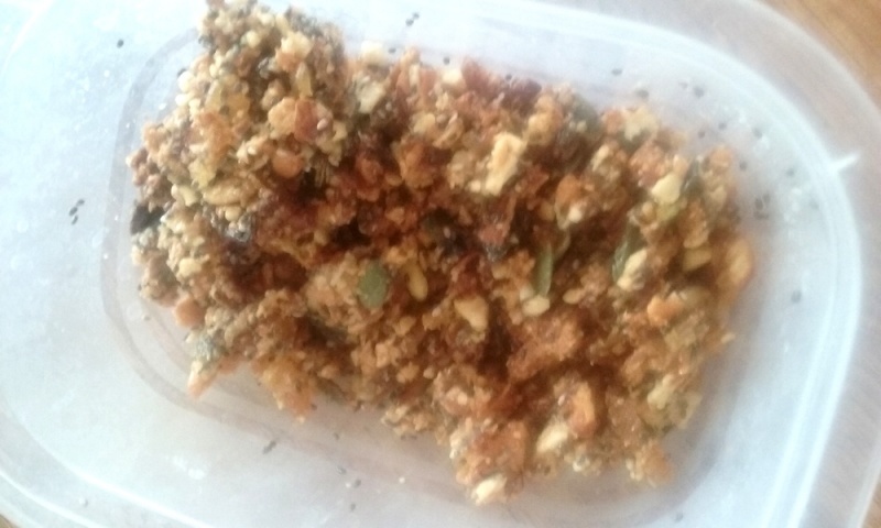 Troubu jsem rozehřála na 160°C. Ořechy a sušené ovoce jsem hodila do mixéru a rozmixovala na takovou drť, spíše aby to byly hrubší kousky, je to pak více křupavé. Směs jsem vyklopila do misky, přisypala dýňová semínka, chia semínka, kokos, zalila medem a kokosovým olejem (v tekutém stavu obojí) a pořádně promíchala (nejlíp to jde rukou). Plech jsem vystlala pečícím papírem, hodila na to celou směs a vložila do trouby na 12 minut. Potom jsem směs promíchala a vložila zpět na dalších 8 minut. Pak jsem směs opět promíchala a pekla posledních 5 minut. Pak jsem ji nechala vychladnout (po vytažení z trouby a při míchaní směs není křupavá, křupavou se stane až vychladne). Rukou jsem směs ještě trochu rozlámala a přemístila do krabičky. Dá se jíst s mlékem, v jogurtu (potom určitě ještě přidat oblíbené ovoce), pokud omezujete mléčné výrobky, určitě doporučuju výše zmiňovaný krém z avokáda a banánu (prostě jen rozmixovat avokádo s banánem
