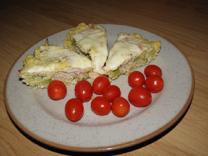 O: jáhlový nákyp s brokolicí, šunkou a sýrem, cherry r., čalamáda