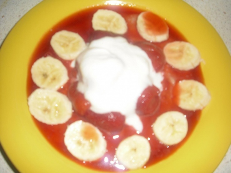 Je to kaše ze sypaného bio oříškového müsli od Alnatury (DM) rozmixovaného a povařeného v mléce. Kaši jsem zahustila lžící špaldové krupice. V rendlíku rozpustila mražené jahody Nowaco s lžící medu. Hotovou kaši jsem obložila banánem, zalila jahodovým přelivem a navrch jsem přidala lžíci bílého jogurtu