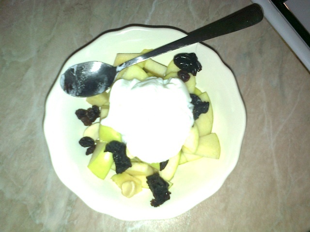Ve: jablko, 2 sušené švestky, 2žice jogurtu, par mandlí a hrozinek