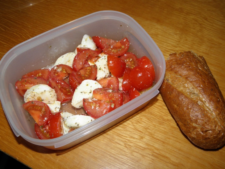 sn: 1tmavá celozrnná houska + 2plátky kuřecí šunky + 2plátky 30% eidam, rajče