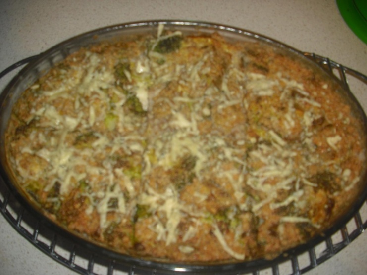 oběd: pohankový nákyp (pohanka, brokolice, hlíva, kuřecí wellness šunka, mozzarela, vejce)