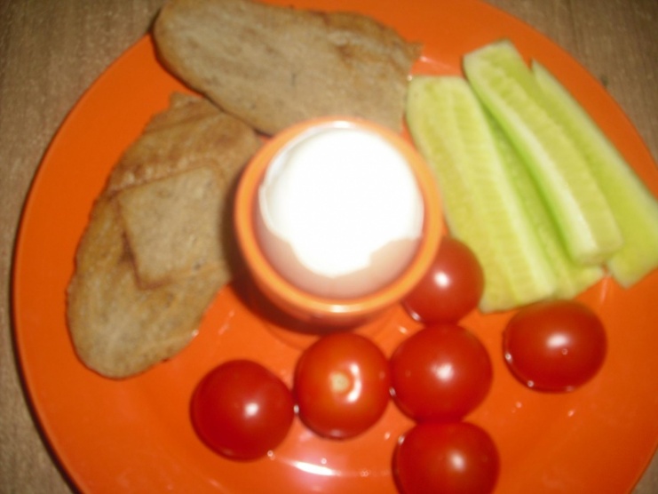večeře: 1 vajíčko na měkko, necelá 1/2 tmavého rohlíku, okurka, cherry rajčátka