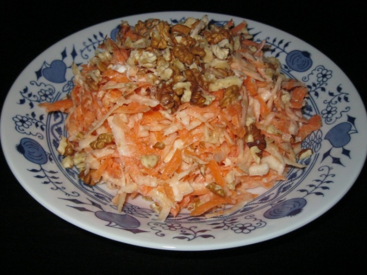 Več.: mrkvovo-celerový salát s jogurtem, posypaný vlašskými ořechy, k tomu cereální kaiserka a 2 plátky šunky
