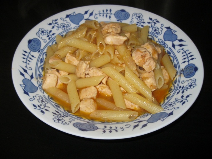 Ob. (12:30): kuřecí prsíčka na cibulce s přírodní paprikovou šťávou, penne těstoviny, k tomu miska kysaného zelí