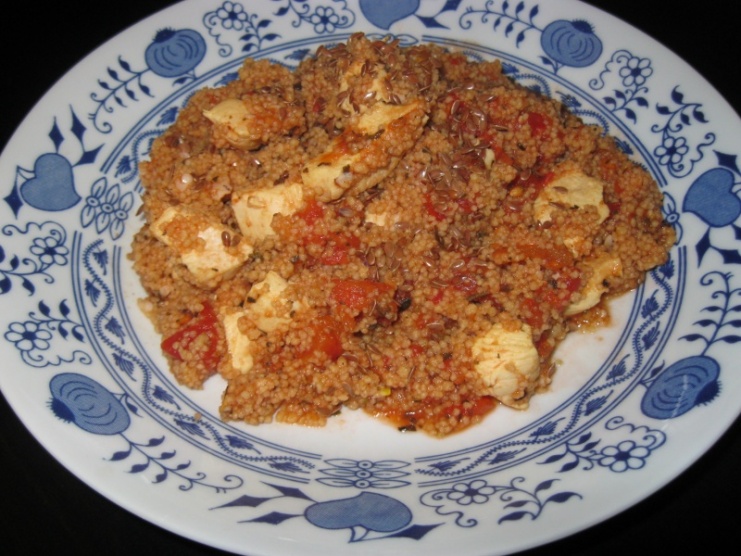 Oběd: bio celozrnný kuskus s kuřecím masem a rajčatovou omáčkou (olivový olej, sekaná loupaná rajčata, bazalka, česnek), sypané lněným semínkem, k tomu miska kysaného zelí