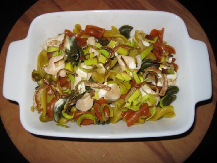 Večeře: tříbarevné amaranthové těstoviny s kuřecím masem, hráškem a pórkem