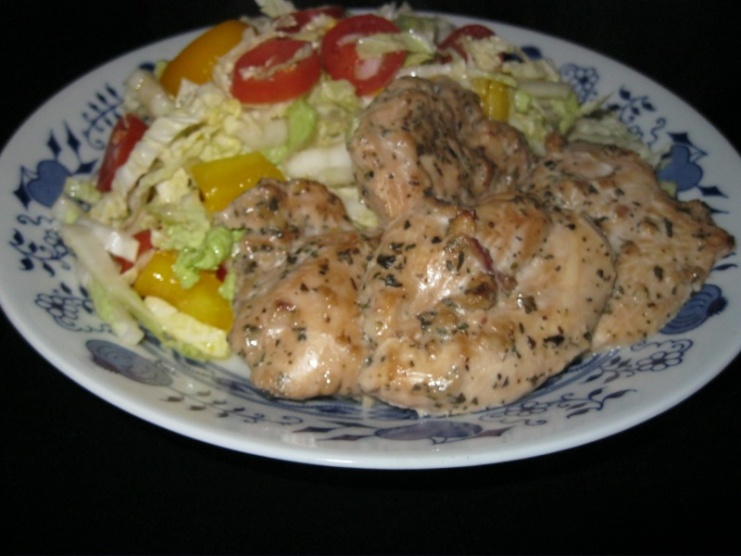 VE: 4 grilované kuřecí medajlonky v jogurtové marinádě, zeleninový salát (250 g)