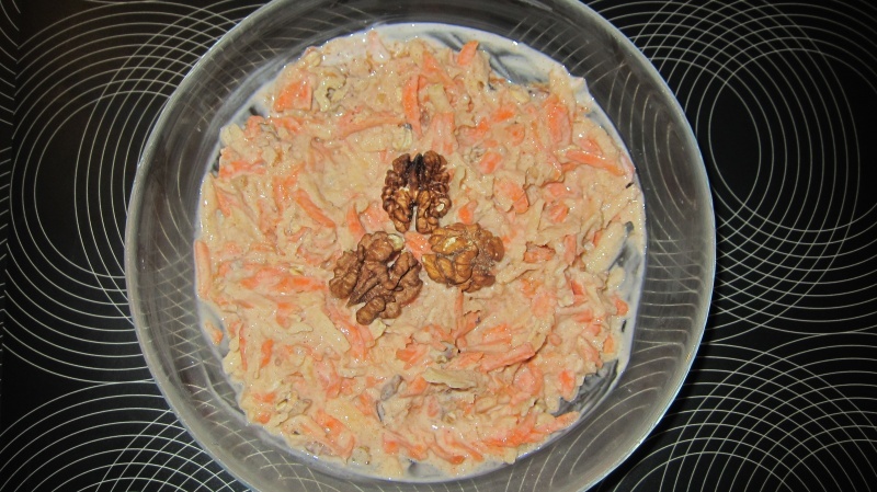 Udělala jsem si salát s mrkve,jablka,bílý jogurt,trochu vloček,vlašských oříšků a skořice