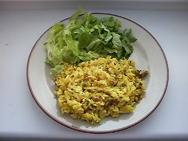 ob: rýže parboiled s jogurtovou kari omáčkou na cibulce a česneku s oříškovou šměsí - pistácie a mandle, různá semínka a k tomu listový salát