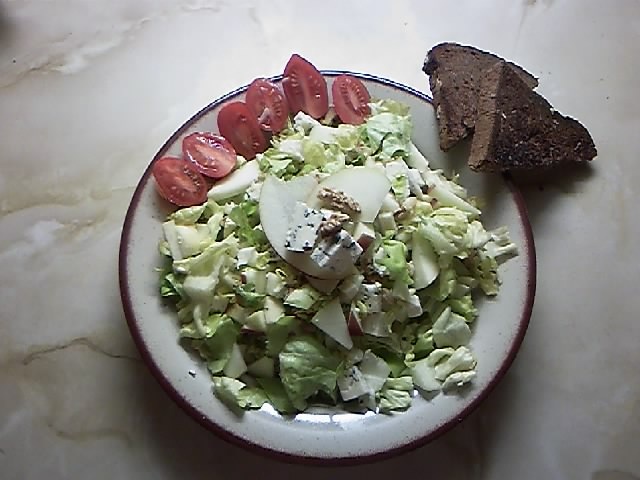 ve: zeleninový salát s jablkem, nivou a vlašskými ořechy, plátek celozrnného chleba