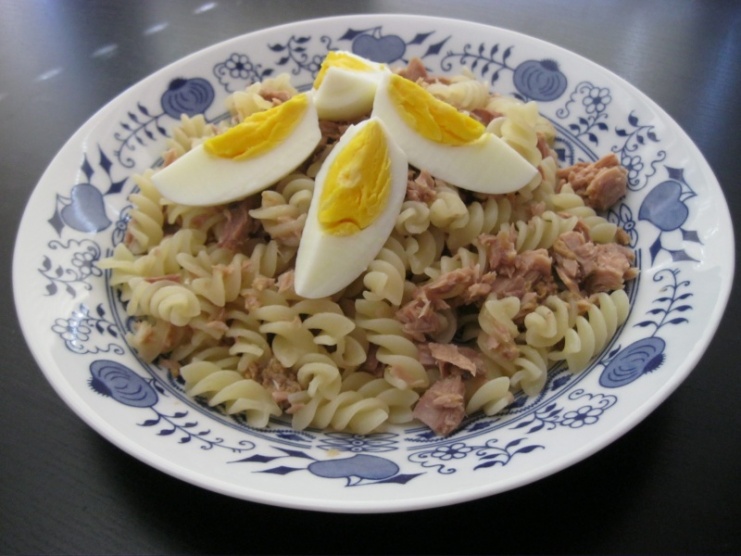 OB: těstoviny (90 g) s tuňákem ve vlastní šťávě a vejcem (50 g)