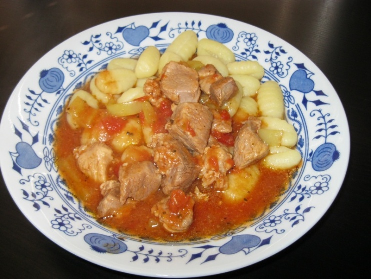 OB: libové kostky vepřového masa dušené na rajčatech a paprice, k tomu bramborové gnocchi a zeleninový salát