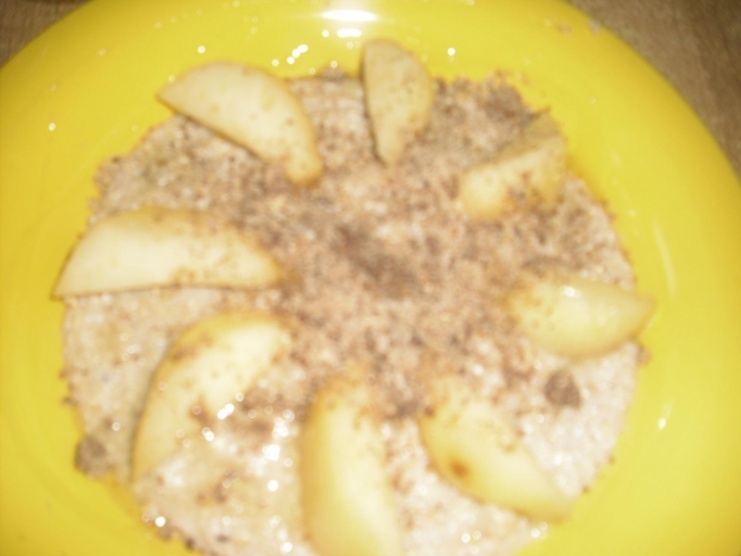 snídaně: pohanková kaše (z lámanky), hruška, lžička mletých oříšků