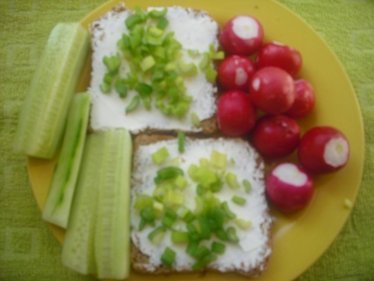 svačina: 2x toustový chléb, česnek, lučina kostka, jarní cibulka, zelenina