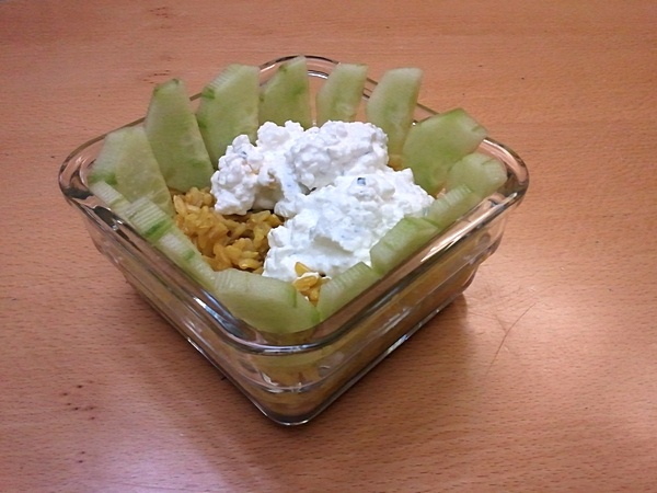Ob. 50 g rýže natural s kurkumou + 150 g cottage pažitkový, kousek salátovky, caro + 2 smetany