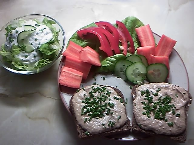 ve: asi dva celozrnné chleby s rybí pomazánkou a horou zeleninového salátu