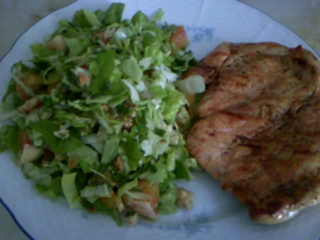 OB: 150g kuřecích prsou, 200g salátu(rajčata, řekvičky, ledový salát, bílý jogurt)
