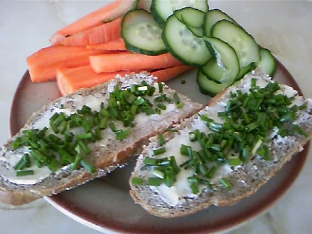 sv: půlka žitný rohlík s máslem a pažitkou, zelenina